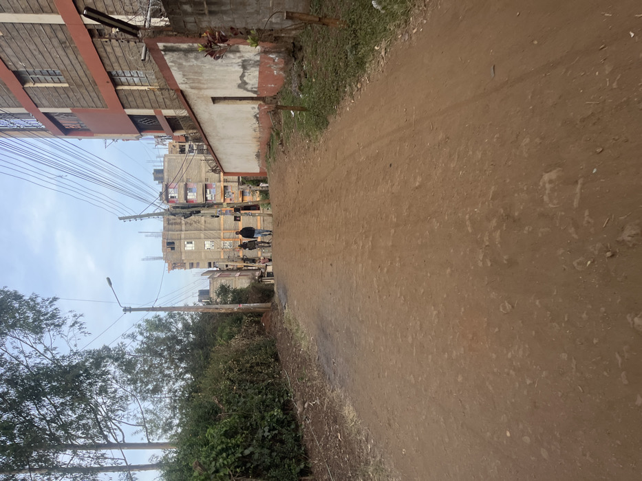 A dirt road stretches into the distance, flanked by buildings on the left and vegetation on the right. Buildings, including one under construction, line the left, with power lines crisscrossing overhead. The road itself is uneven and marked with scattered debris. On the right, a dense green thicket borders the road. A few figures are walking toward the buildings in the distance, appearing small against the urban backdrop.