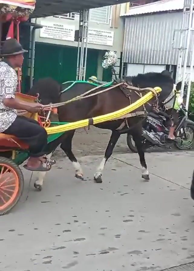 A horse is harnessed to a small yellow cart with orange wheels on a street. A black minivan passes the horse and cart, followed by a man on a motorcycle with a passenger. The horse and cart continue down the street. A red car appears in the frame briefly. The buildings are modest, and signs for "Rizky Catering" and "Resto Suramadu" are visible.