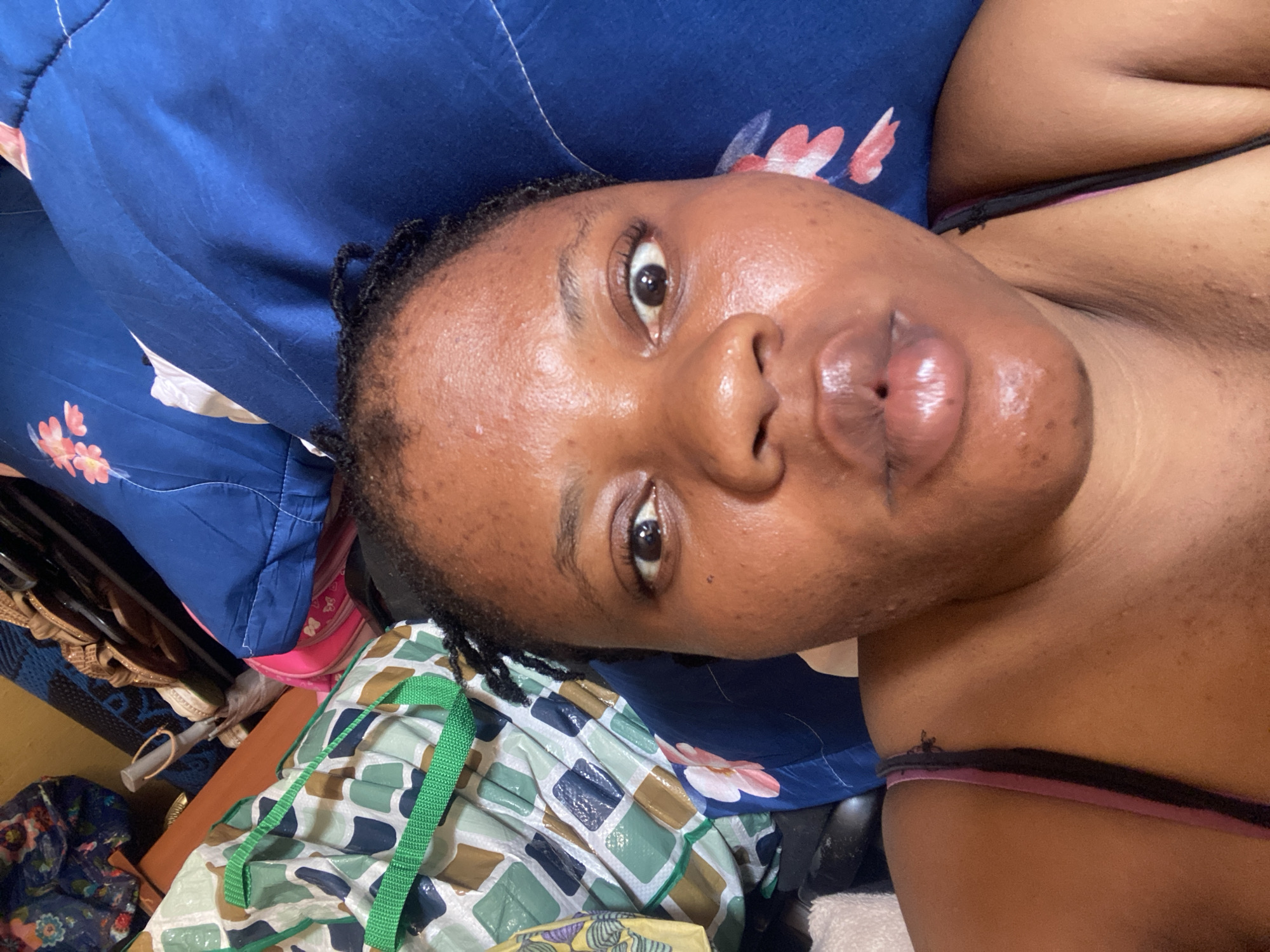 A close-up, angled image depicts an adult female subject with dark skin, lying on a dark blue sheet patterned with white and pink floral motifs. She looks directly into the camera with slightly pursed lips. A dark-colored strap and a pink strap are visible on her upper left torso. The background, within an indoor setting in Narayi, Nigeria, shows a cluttered area containing a prominent reusable shopping bag with a geometric green, white, blue, and brown pattern and a green handle. Additional items partially visible include a pink bag, brown-strapped sandals, and various other textiles.
