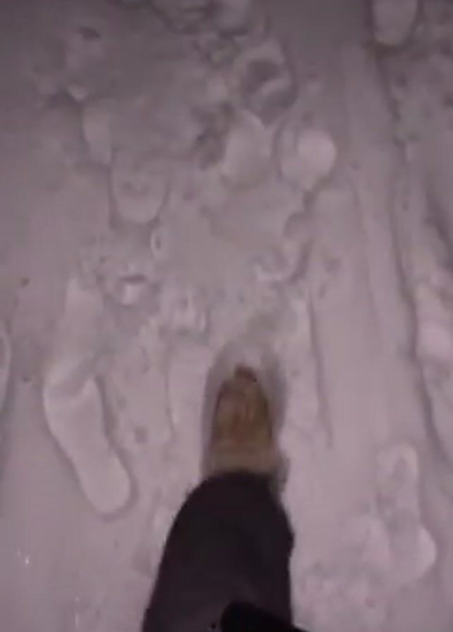 first-person perspective of a person walking in the snow. The snow is uneven, with many footprints and tracks. The person is wearing brown boots, dark pants, and a dark jacket or coat. The overall lighting is dim, suggesting that it's either nighttime or a very overcast day. The camera moves along with the person's steps.
