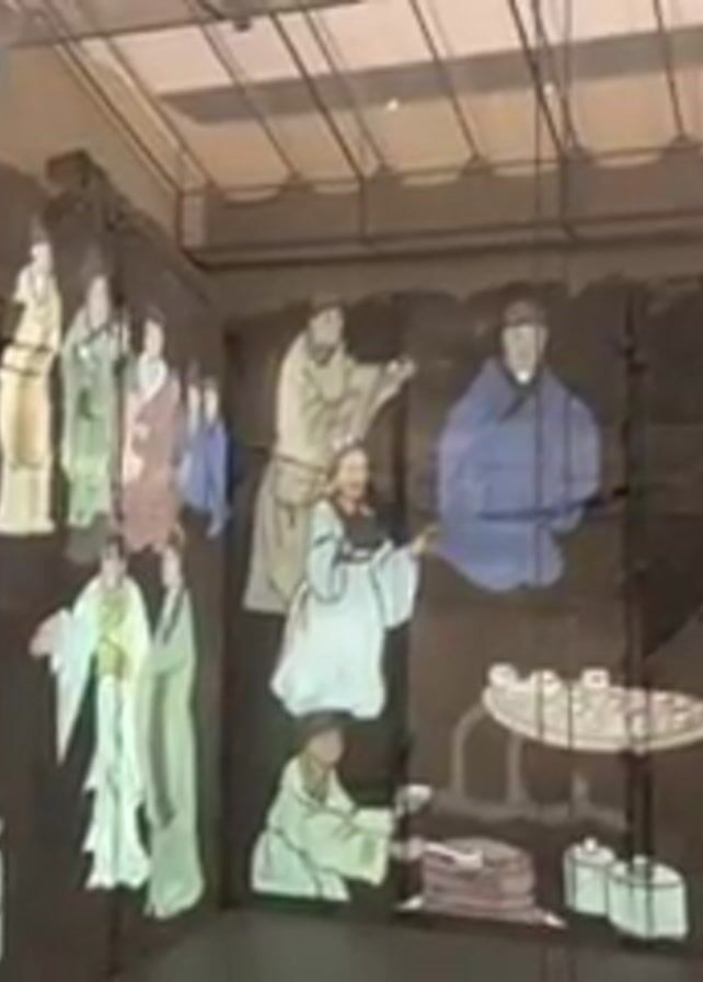 museum exhibit where a large, dark, stone wall is being used as a canvas for a colorful animated projection. The projection depicts a traditional Chinese scene, with figures in robes, tables set with tea cups, and what appears to be food. The wall is cracked and appears to be ancient. A person is standing in the foreground, viewing the exhibit. The lighting is dim, with a few spotlights illuminating the scene. There are visible beams or wires on the ceiling above. The space appears to be indoors.