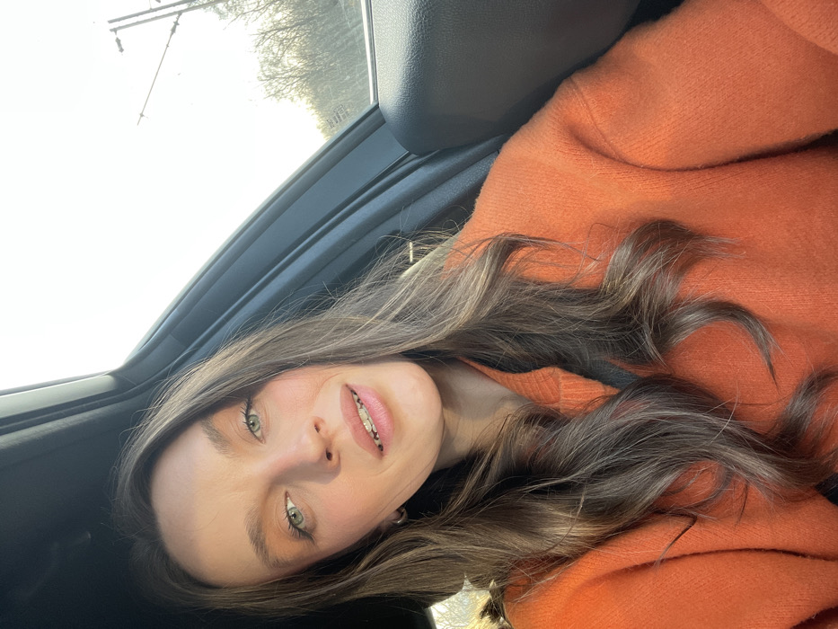 The image displays a female subject in a vehicle, positioned in a close-up, chest-up shot. The subject, with long, wavy, brown hair and green eyes, looks directly into the camera with a subtle smile, revealing dental braces on her upper teeth. She is wearing an orange, textured knit sweater, with a dark seatbelt strap visible across her chest. The interior of the vehicle, characterized by dark panels and a door frame, is partially visible. Through the passenger window, a bright, hazy sky is discernible, along with the distant outlines of bare trees and a utility pole. Natural sunlight illuminates the subject's face from the right. The specific location within the city of Bistrice, Montenegro, is not discernible from the visual information provided in the image.