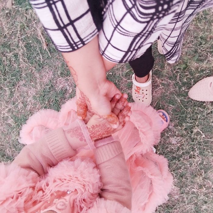 A high-angle view depicts the hands and lower legs of two individuals on a sparse grassy surface. On the left, a child wears a light pink ruffled dress over beige long sleeves, with sequins visible on the dress's upper portion. Both the child's visible hands are decorated with intricate reddish-brown henna patterns. Light blue sandals are visible on their feet. On the right, an adult in a black and white plaid garment holds the child's right hand with their left hand, which is also adorned with reddish-brown henna patterns. The adult's right foot wears a beige Crocs-style sandal featuring a red bow and "BABY" text on the strap; their left foot wears a light pink textured flat shoe. The ground consists of dry, sparse green grass and visible dirt patches. The precise location within the city of Lassan, Pakistan, is not discernible from the image.
