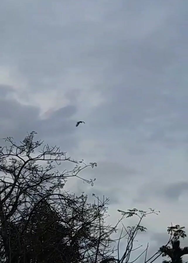 bird flying in a cloudy sky, with tree branches in the foreground. The bird is a dark silhouette against the gray sky. There are also palm tree fronds visible in the shot. The overall scene is somewhat muted in color due to the overcast sky.