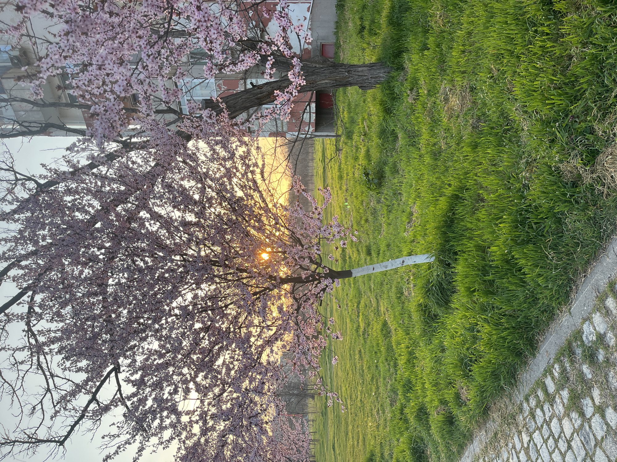 The image depicts a spring evening scene in an urban green space within Plovdiv, Bulgaria. In the foreground, a cobblestone pathway with a concrete curb borders a patch of dense, vibrant green grass. Beyond the pathway, several trees in full bloom with pink blossoms are visible. The central tree in the mid-ground has its lower trunk painted white. The setting sun is low on the horizon, positioned directly behind this central tree, casting an orange glow through its branches and illuminating the scene from the left. To the right, a multi-story residential building with a weathered facade is partially obscured by another blossoming tree. The building exhibits peeling paint, revealing red and other indeterminate colors beneath. Multiple windows are visible on its exterior. The background features more green grass and additional trees, some appearing bare, extending towards a distant, lightly wooded area. The sky above is clear, transitioning from light blue to a warm orange hue near the horizon. No individuals are present in the scene.