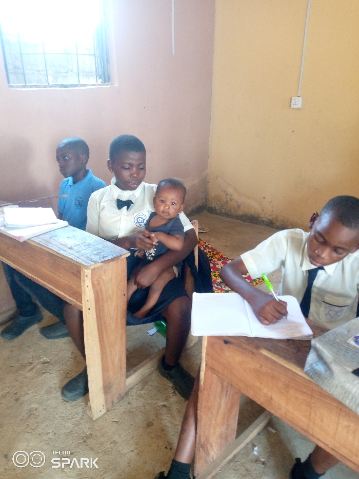 The image depicts an indoor scene, likely a modest classroom or study area, in Ajaokuta, Nigeria