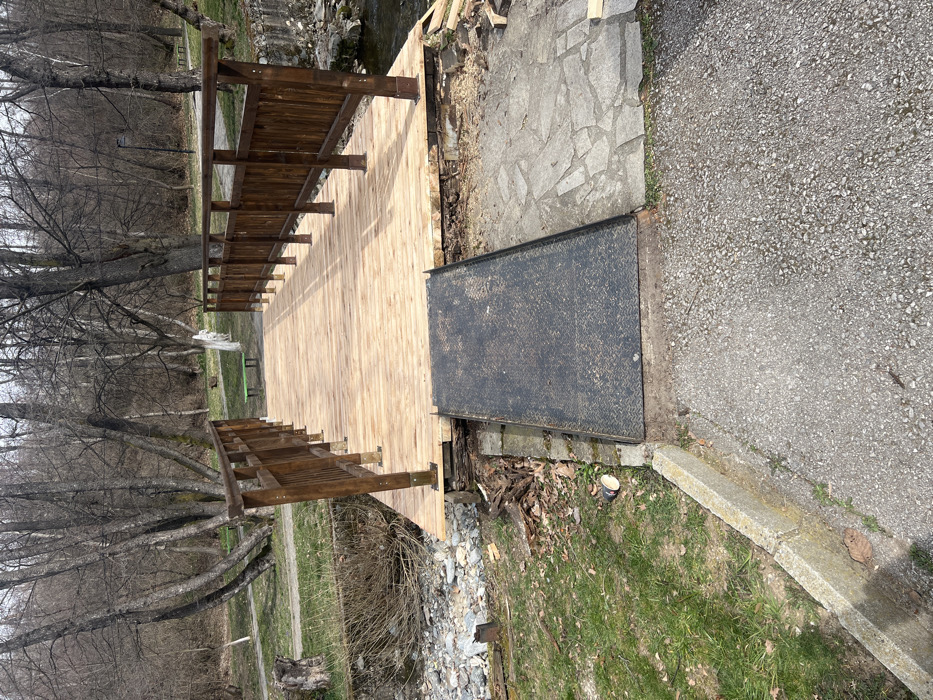 The image depicts an outdoor park environment in Dupnitsa, Bulgaria. In the foreground, a gray gravel path is present, bordered on the left by a concrete curb. A black metal diamond-plate ramp connects the gravel path to the base of a wooden footbridge. To the right of the ramp, a path composed of irregular stone slabs extends. A white and black disposable cup lies on the grass beside the concrete curb on the left. The midground features a newly constructed or recently refurbished wooden footbridge spanning a shallow, stony stream. The bridge deck consists of light-colored wooden planks, and it is equipped with dark brown wooden railings supported by posts with dark metal bases. The banks of the stream show exposed earth, roots, and scattered organic debris. The background reveals a park-like setting with numerous deciduous trees exhibiting bare branches, indicating late winter or early spring. Patches of green grass and bare ground are visible among the trees. Two green park benches and a black streetlight pole are discernible further into the park. A white, upright, possibly sculpted object is situated among the trees on the far bank. No people, specific actions, or interactions are visible in the scene.