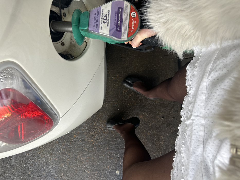 A first-person, downward-angle photograph captures a person refueling a white vehicle. The individual's legs are visible, clad in dark sheer tights and black split-toe flat shoes. A white, textured dress or skirt with a ruffled hem covers the upper thighs. The right hand, partially obscured by a light-colored furry jacket sleeve, holds a green fuel pump nozzle. The nozzle is inserted into the fuel filler port of a white car, a portion of which, including a red taillight assembly, is visible on the left. Attached to the fuel nozzle is a purple label advertising "MIS-SOLD CAR FINANCE?" with contact information "LetSolicitors.co.uk" and a red sticker indicating "Supreme+ 99 E5" fuel. The ground is dark, wet asphalt or concrete. The specific location within Maidstone, United Kingdom, is not discernible from the image.