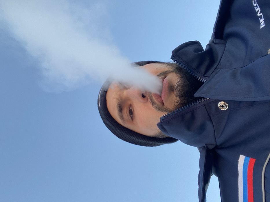 A man wearing a beanie and a navy blue jacket is centered in the frame, angled upwards towards a clear blue sky. White vapor or smoke billows from his mouth. The jacket has a Russian flag-inspired stripe of white, blue, and red. The label "BEAEOC" is partially visible on the upper right. The man has dark hair and a beard. The picture is taken at a low angle, highlighting the sky and the man's features.