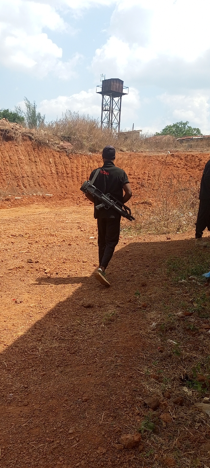 The scene, set in Ayale, Nigeria, depicts an outdoor environment under a partly cloudy sky. A male subject, viewed from behind, walks away from the camera on an unpaved, reddish-brown dirt path. He wears a black short-sleeved shirt emblazoned with "HGN" in white on the back, black trousers, and light-colored athletic shoes. A dark-colored, bullpup-style rifle is slung over his right shoulder. The lower legs and feet of a second individual are partially visible on the far right. To the left and center-background, a significant bank of reddish-brown earth displays vertical striations, indicative of excavation or erosion. Above this, a rusty, box-shaped water tank supported by a metal lattice tower stands against the sky. The surrounding terrain consists of dry, reddish-brown soil with sparse patches of dry grass and scattered small rocks. A long shadow extends diagonally across the lower left foreground.