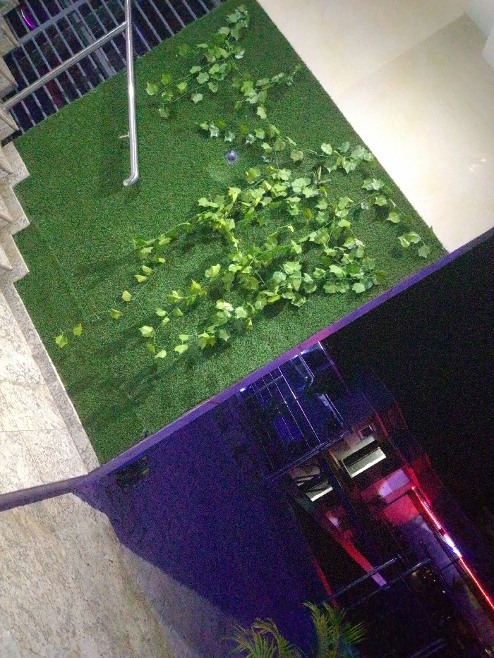 A high-angle shot reveals a mix of indoor and outdoor elements. A set of stairs is visible with artificial turf covering part of it, adorned with green vines. A metallic handrail is also present. Adjacent to this area is a wall with a reflective surface, mirroring what appears to be a building interior featuring red lighting and windows. A hint of green foliage peeks from the bottom edge of the reflective surface.