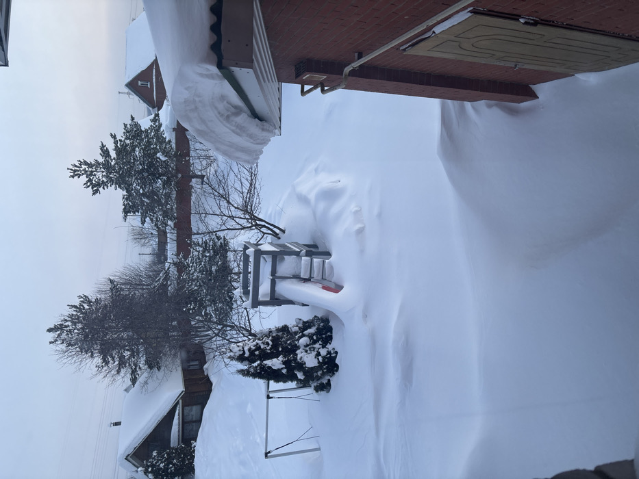 A snowy scene shows a yard covered in deep drifts
