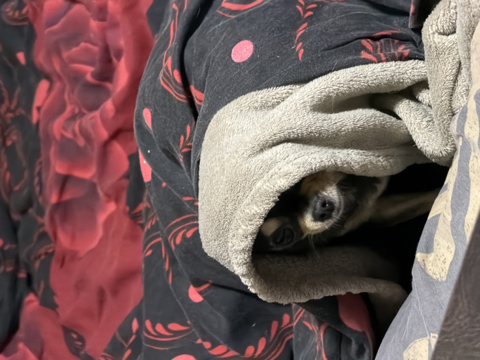 The scene depicts an indoor environment, specifically a bed, located in Stara Zagora, Bulgaria. A small, short-haired black and tan Chihuahua is positioned partially underneath a light grey, textured blanket or towel, which forms a hooded enclosure around its head. The dog's face is visible, looking slightly towards the right side of the frame, with its dark eyes discernible from within the shadow of the blanket. Behind the dog, and partially beneath the grey blanket, is a black duvet cover featuring red floral or stylized patterns. Further in the background, a red blanket or comforter with darker, possibly black, design elements is present. A portion of a grey and beige patterned sheet or pillow is visible in the lower left foreground.