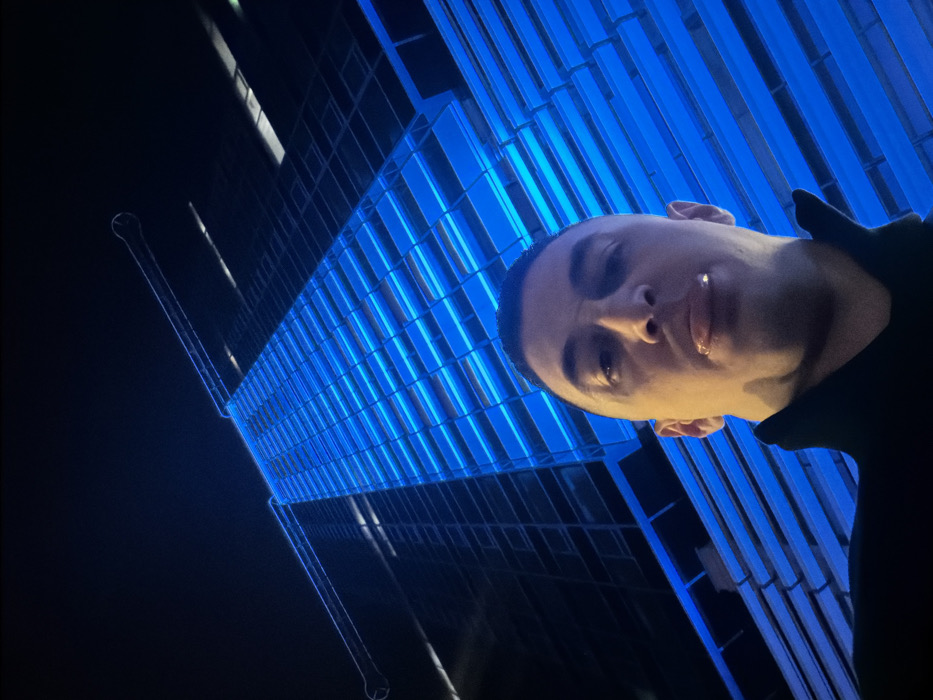 A male subject with short, dark hair and a dark, high-collared garment is captured in a close-up, upward-angled selfie. His face is illuminated from below by blue light. He has his mouth slightly open with his tongue partially extended, showing what appears to be a piercing. The background features a tall, modern skyscraper, the Millennium Center, located in Sofia, Bulgaria. The building's facade is uniformly illuminated with a vibrant blue light, highlighting its rectangular window patterns or structural elements. The skyscraper rises into a dark night sky, with faint outlines of construction rigging or architectural features visible at its summit. The scene is static, devoid of overt interaction beyond the subject's pose for the photograph.
