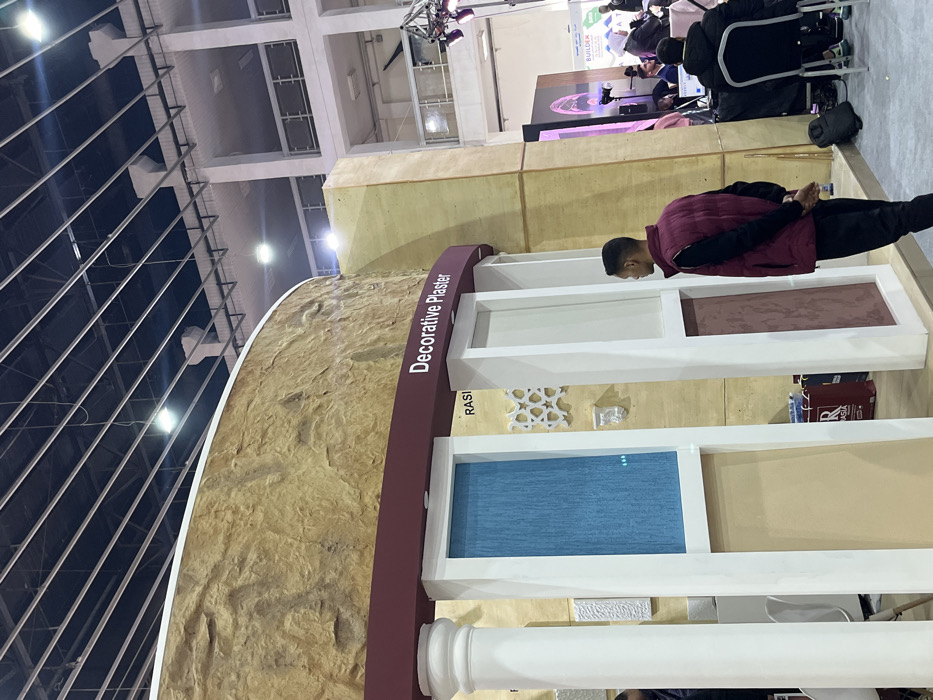 This image depicts an interior scene at an exhibition or trade show located in the city of Shab'a, Syria