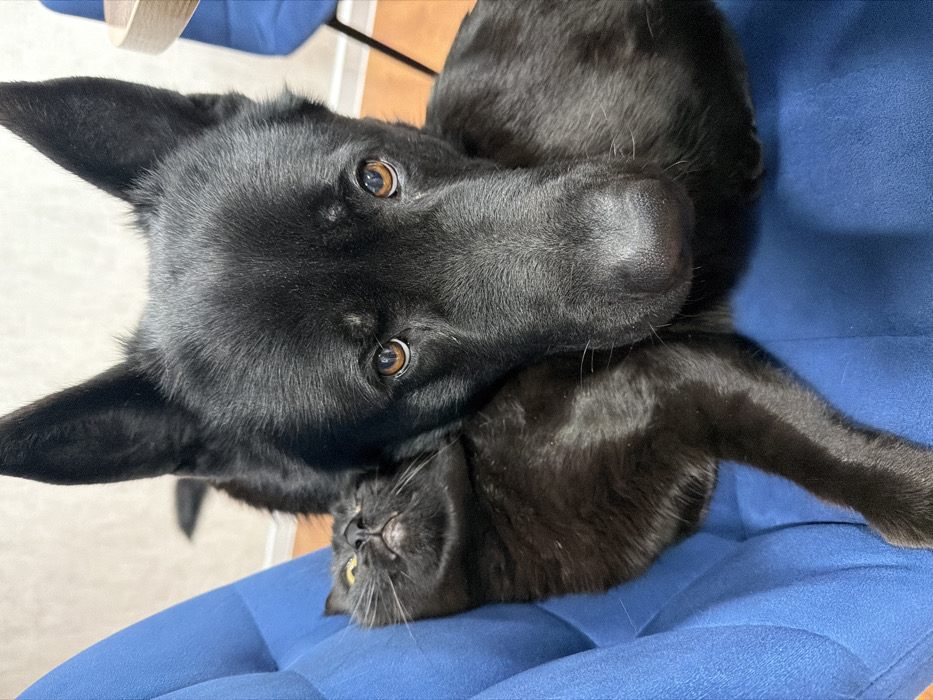 - "A black dog with erect ears rests its head on a black cat on a blue quilted chair" by FM-kDhAx1, licensed under CC BY 4.0
