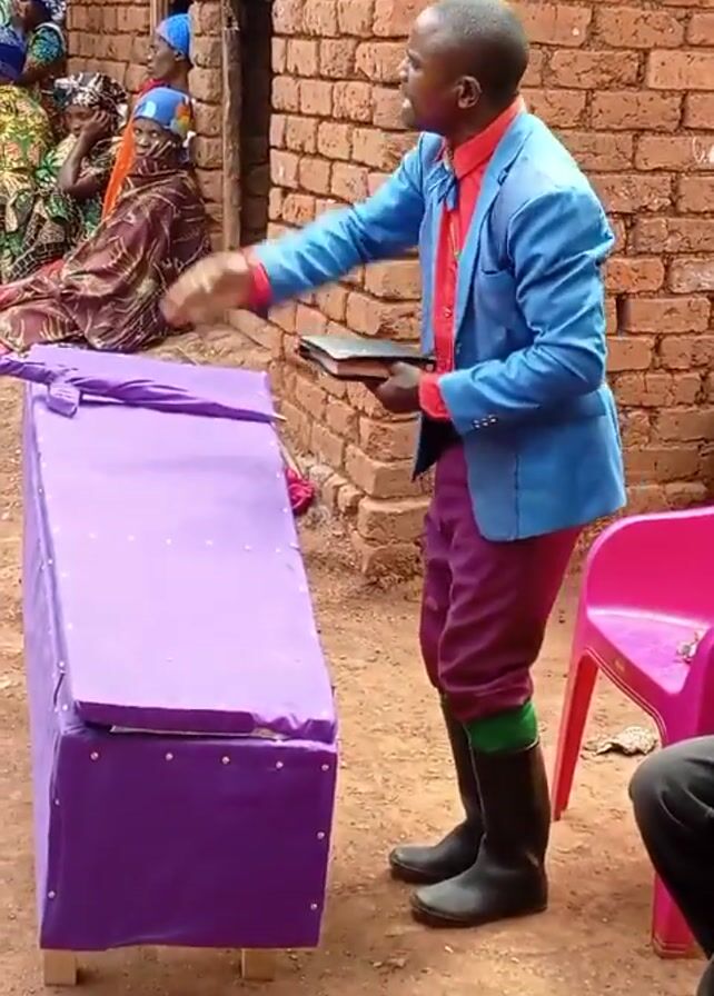 A man in a blue suit is standing in front of a purple box, likely a coffin, and addressing a group of women seated on the ground near a brick building. The man gestures with his right hand while holding a book or tablet in his left. He is wearing a red shirt, purple pants, green socks, and black boots. The women are dressed in colorful clothing and head coverings, sitting and listening. The background shows a simple brick building with a blue door. The setting appears to be an outdoor area with a dirt ground. The scene seems to be a somber event, possibly a funeral or memorial service.