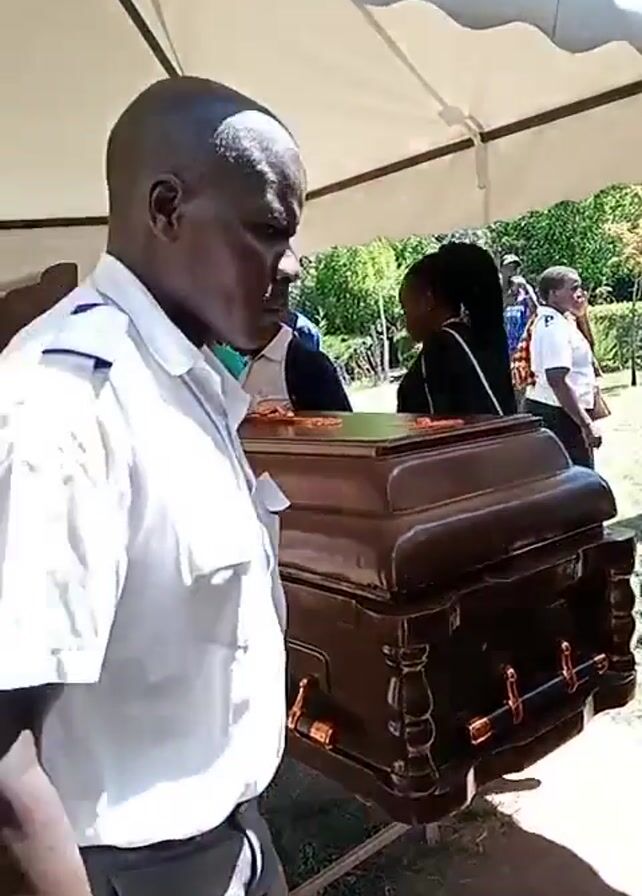 group of people gathered around a casket under a white tent, possibly at a funeral or memorial service. The casket is a polished, dark brown color with gold-colored handles and is placed on a stand. People are dressed in various attire, including a white shirt with a dark tie and a security uniform. Some individuals are looking at the casket, while others stand around observing. The surroundings consist of a grassy area with trees visible in the background.