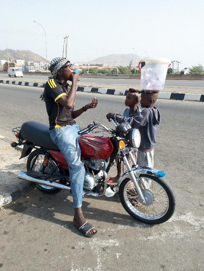 A man in a black and yellow shirt, jeans, and a checkered head covering sits on a red motorcycle, drinking from a container. Two children stand near the motorcycle; one has a large, clear bucket filled with water balanced on his head. The scene unfolds on a paved road with a mountain backdrop. The atmosphere is bright and sunny.