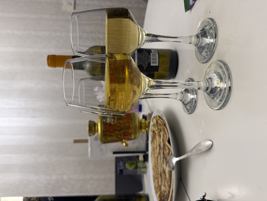 Two wine glasses filled with white wine rest on a white surface. A bottle of white wine is partially visible behind the glasses. Nearby sits a samovar and a plate of pancakes with a serving utensil. The scene suggests a casual indoor setting, possibly a celebration or a meal gathering.