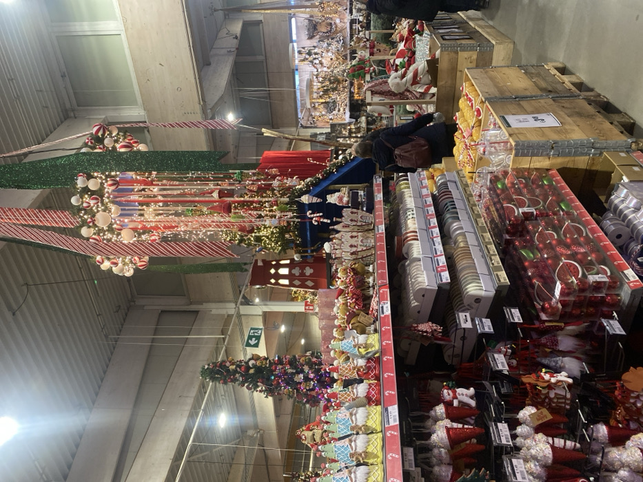The image depicts an interior retail space specifically designated for Christmas seasonal merchandise, located in Mouscron, Belgium