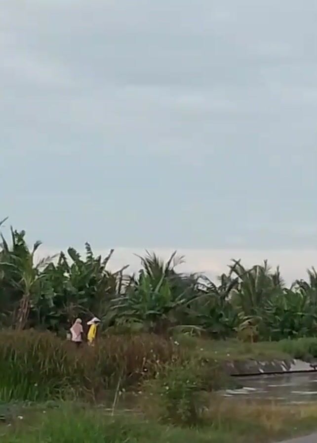 n outdoor scene under a cloudy sky. The camera is low to the ground. In the foreground, there is lush green grass and foliage, leading to a line of banana trees and other tropical plants. In the middle ground, there are three people, presumably workers, tending to the land near the trees. One is wearing a blue shirt and the other two are wearing yellow shirts. They are partially obscured by the vegetation. In the background, a gray, cloudy sky dominates the view.