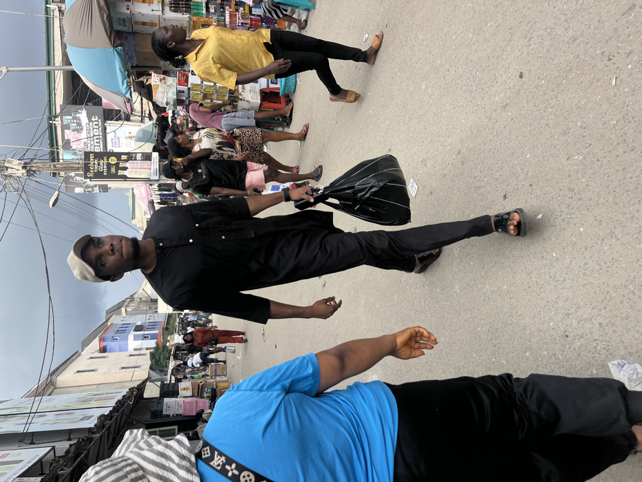 This image captures a bustling street scene in Satellite Town, Nigeria