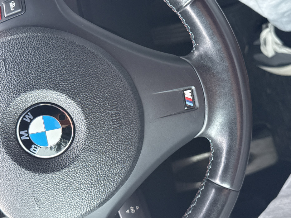 The image displays a close-up, downward-angled view of a black, multi-function steering wheel within a BMW vehicle interior