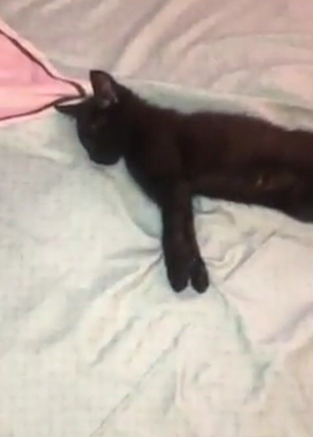 A short video shows a small, black kitten lying asleep on its side on a bed with light blue patterned sheets