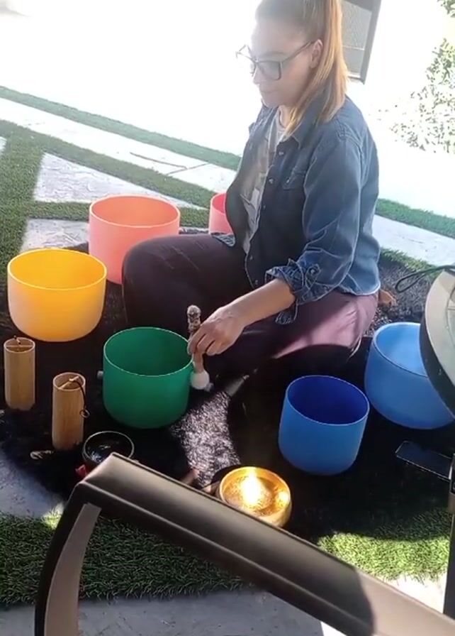 A woman with her hair in a ponytail, wearing glasses and a denim jacket, is sitting cross-legged on a black rug. Around her are several colorful crystal singing bowls in yellow, peach, green, and blue. She is holding a mallet and striking the green bowl. There are also a few wooden objects and a lit candle on the rug. The rug is placed on what appears to be artificial green turf. A black object partially obstructs the lower part of the view. The scene is outdoors on a sunny day.