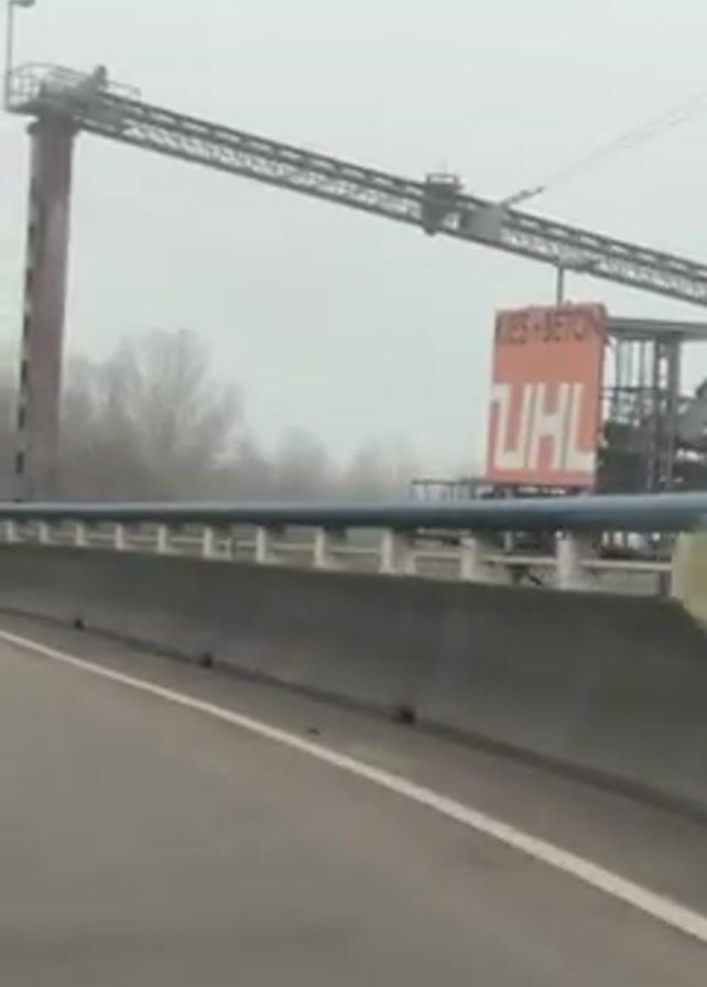 view from a vehicle driving on a highway. A grey concrete barrier with a blue railing runs alongside the road. Beyond the barrier, there is a blurry line of bare trees in the background due to the heavy fog. A large crane structure with a sign is visible initially, but it quickly moves out of frame as the car drives past. The sky is obscured by the thick fog, making the scene appear muted and indistinct.