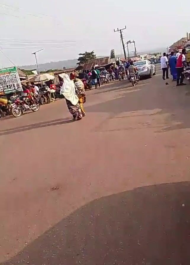 busy street scene in what appears to be a town or city in Africa. The road is paved and mostly reddish-brown in color. There are people walking, riding motorcycles, and standing around. Some people are wearing traditional clothing, while others are dressed in more modern attire. Several motorcycles are visible on the street, along with at least one car. There are shops and buildings lining the street, and some street vendors are selling goods. The weather appears to be sunny and clear. The camera seems to be positioned inside a vehicle.