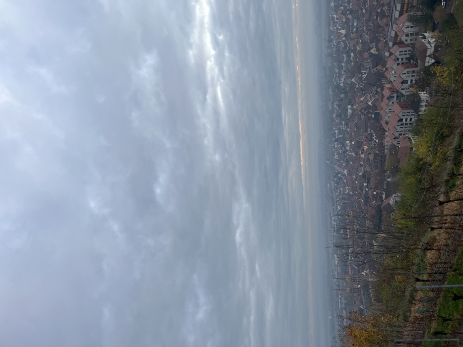 An elevated, wide-angle photograph captures a panoramic view of Obernai, France, under an overcast sky. The foreground features a dormant vineyard with trellised vines, mostly bare, and sparse deciduous foliage displaying remnants of yellow and green. Below the vineyard, the midground reveals a dense urban landscape characterized by numerous residential and commercial buildings with predominantly dark red or terracotta-tiled pitched roofs. A prominent religious structure with two distinct spires is visible on the left side of the town. Towards the lower right, a cluster of modern, multi-story buildings with identical, light red-orange gabled roofs stands out. The background shows the city extending into a hazy distance, merging with a flat, indistinct horizon under a continuous blanket of gray clouds. No individuals or specific actions are discernible within the frame. The overall lighting is muted and diffused, suggesting a late autumn or winter day.
