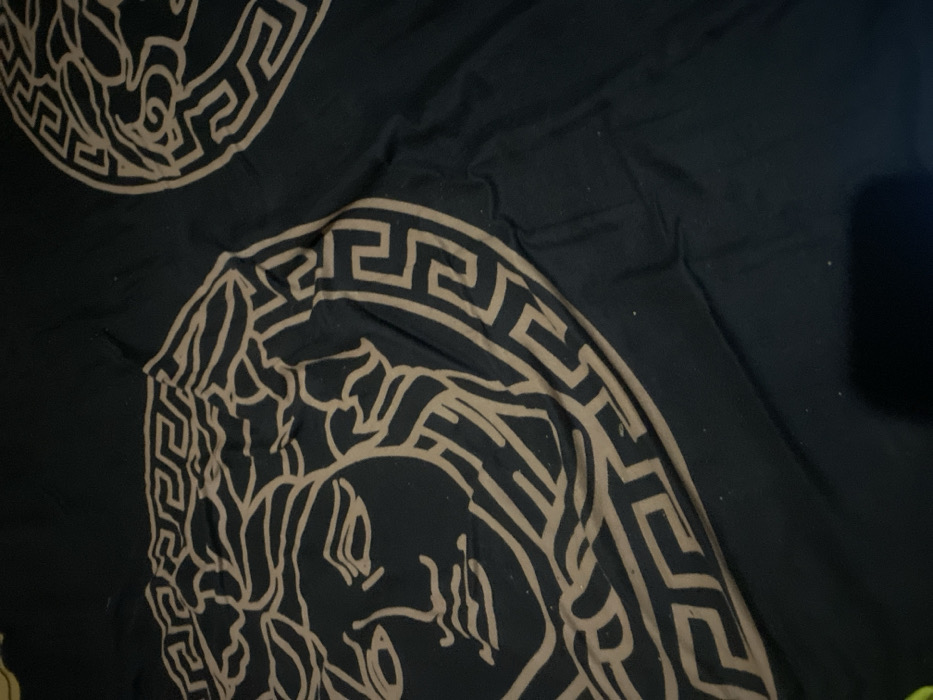- "The scene depicts a dark-colored textile, possibly black or dark navy, featuring a repeating pattern of the Versace Medusa head logo and Greek key border" by FM-HLBxn2, licensed under CC BY 4.0