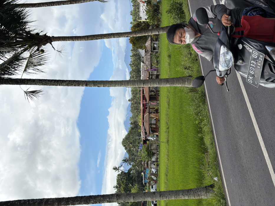 An individual on a motorcycle pauses beside a green rice field under a sky filled with clouds. Palm trees stand tall along the field's edge, framing a view of traditional buildings and lush vegetation. The motorcycle's license plate is visible, while the rider wears a face mask. The road, a strip of dark asphalt, cuts through the vibrant landscape.
