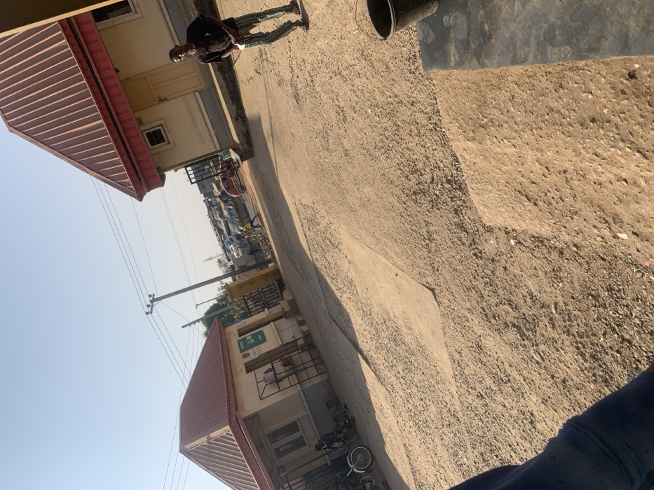 The image depicts a dusty, unpaved open area in Ado, Nigeria, under a clear, bright sky