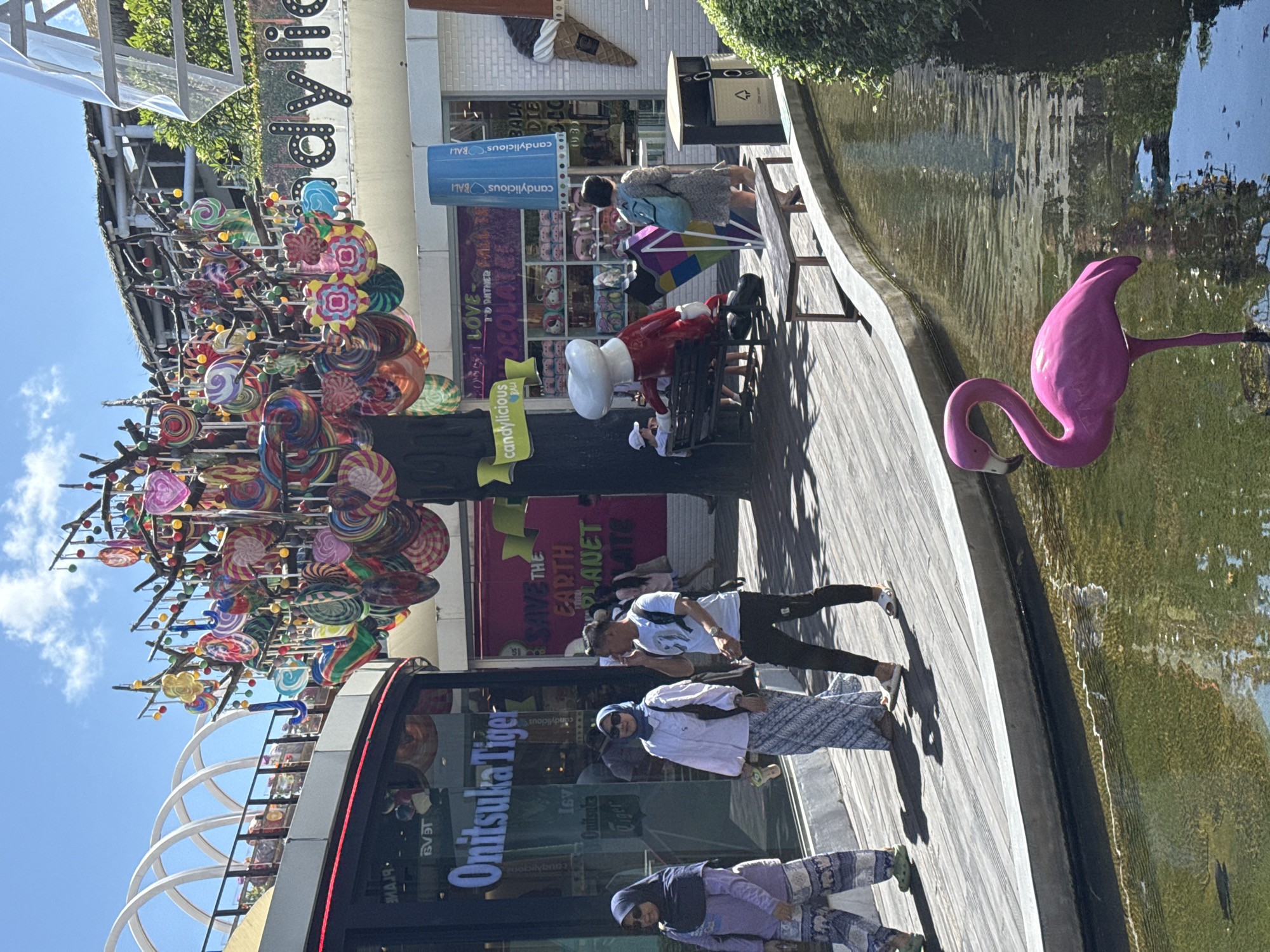 scene at Beachwalk Shopping Center in Kuta, Indonesia. The foreground features a wooden boardwalk next to a water feature with a pink flamingo statue. People are walking along the boardwalk, including women wearing headscarves and loose-fitting clothing. A man in a white t-shirt and dark pants is also walking. Adjacent to the boardwalk is a storefront with the words "Onitsuka Tiger" visible on the window. Above the storefront, there's a sign that reads "SAVE THE EARTH PLANET." Nearby is the Candylicious shop, recognizable by colorful lollipop decorations and signage. Other features include green vegetation, and a partially visible white awning. The sky is blue and sunny.