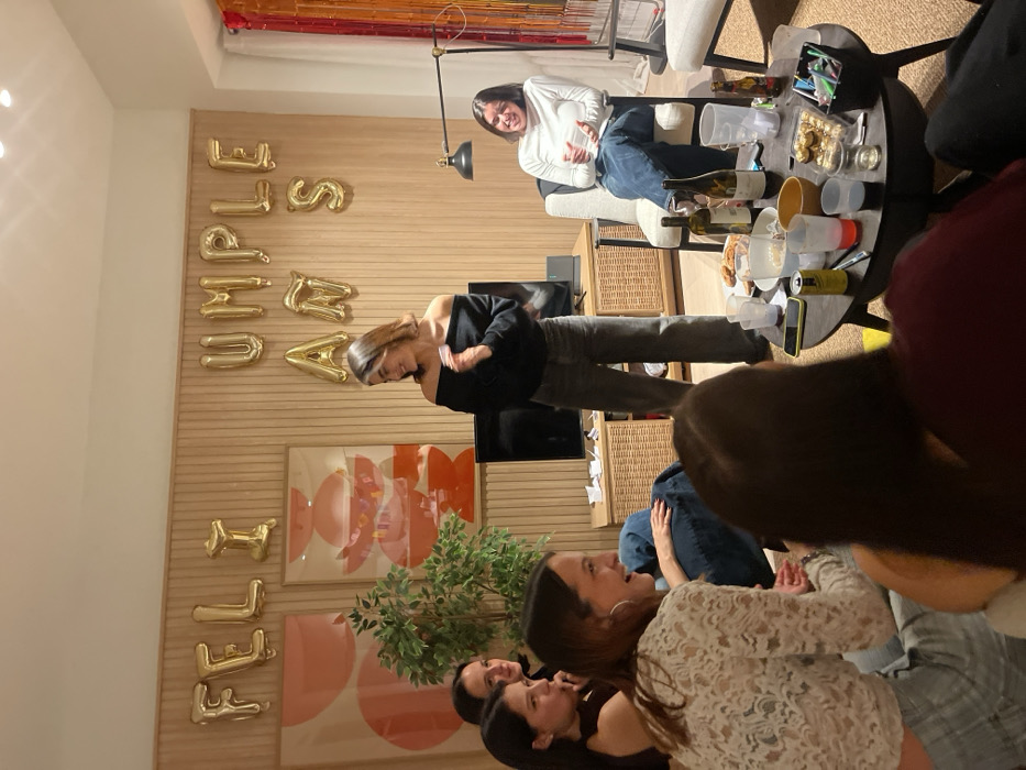 People are gathered at a party. A woman stands with her arms crossed, wearing a black sweater and gray pants. Above her, balloon letters spell "Happy Birthday". Other people are seated, some looking at the woman standing. A round coffee table is cluttered with cups, bottles, and snacks. Another woman sits in a chair in the background, laughing. There are two large framed pictures and a decorative tree. The lighting appears to be warm, creating a cozy atmosphere.