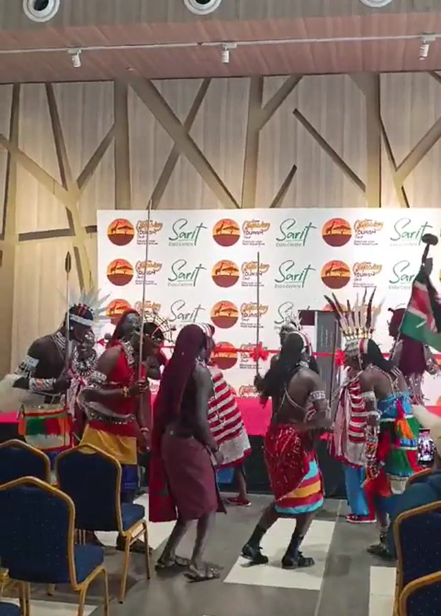 A group of men, dressed in traditional East African attire, are dancing in a room with chairs, a Kenyan flag, and a backdrop with the logos of "Sarit Expo Centre