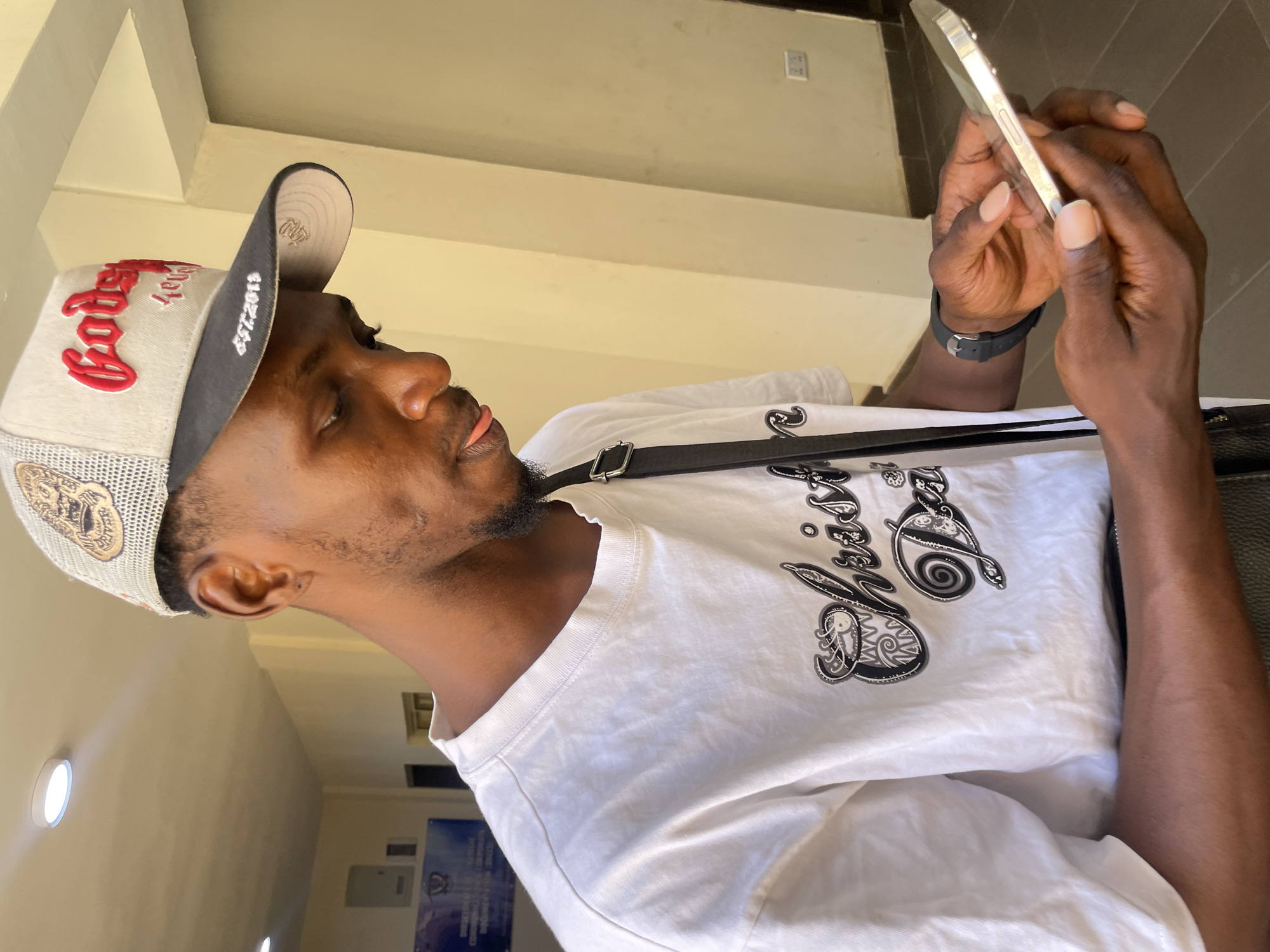 An adult male stands indoors, appearing to be within an official or corporate building in Lokoja, Nigeria. He is seen from the waist up, slightly angled to the right, with his gaze directed downwards towards a light-colored smartphone held horizontally in both hands. The individual has a dark complexion, stubble on his chin and jawline, and a slightly extended tongue, indicating concentration. He wears a beige and black trucker cap with red "Godspeed 4eva" embroidery on the front and "EST.2019" on the black brim. His attire includes a white short-sleeved t-shirt featuring dark, ornate script embroidery across the chest. A black strap, consistent with a messenger bag or sling bag, crosses his torso. A black digital watch is worn on his left wrist. The indoor environment features light beige walls and a dark tiled floor. Circular, flush-mounted light fixtures are visible on the ceiling. In the left background, a blue sign or banner is partially visible, displaying a white stylized eagle emblem and fragments of white text, including "DIRECTORATE OF COMMUNICATIONS" and "CORPORATE". On the right wall, a white double electrical outlet is mounted. The scene suggests the man is engrossed in using his smartphone within a public or administrative building.