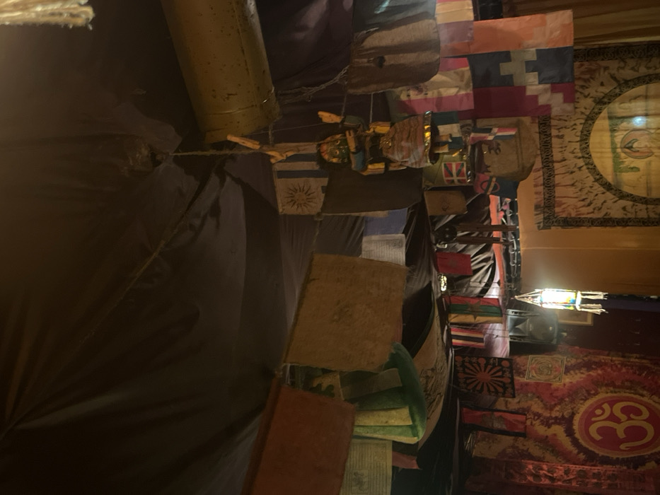 A cluttered interior space features hanging prayer flags of various colors and designs. A dark draped fabric dominates the left, contrasting with the vibrant flags on the right. An old metal pipe and decorative elements are suspended from the ceiling. A tapestry adorns the back wall, and a red and pink rug with a prominent symbol lies on the floor.