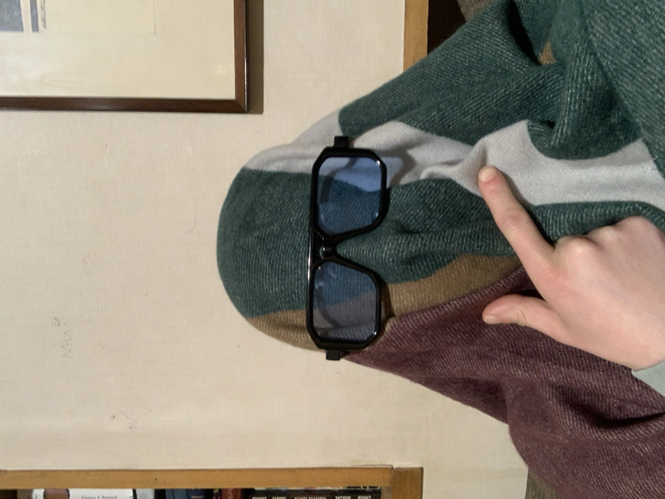 A person's hand points to a striped woolen blanket draped over something out of view. The blanket features stripes of green, gray, and brown. Blue-tinted sunglasses with black frames are placed on the blanket. A framed picture hangs on the wall in the background above a bookshelf, only partially visible. The image is vertically oriented.