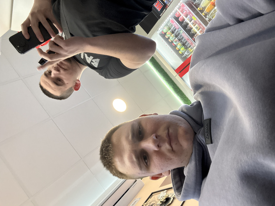 The image presents two young adult males within an indoor commercial setting, identified as a convenience store or kiosk, located in Stara Zagora, Bulgaria. The perspective is a low-angle selfie. In the foreground, a male with short brown hair, a light complexion, and visible facial acne wears a light purple hooded sweatshirt. A black rectangular patch bearing the word "KARMA" is affixed to the chest of the sweatshirt. He looks directly at the camera with a neutral expression. Positioned behind and to the right of the foreground subject, a second male, also with short brown hair and a light complexion, wears a black short-sleeved t-shirt with a partial white graphic print on the front. He holds a black smartphone vertically in his left hand and a small black object (potentially a vape pen) in his right hand, interacting with the phone. His gaze is directed downwards towards the device. The immediate environment features a white tiled ceiling with a single circular recessed light fixture and a partially visible air conditioning unit on the upper left. The background includes a section of a decorative metallic wall hanging on the left. To the right, a large refrigerated display unit, stocked with assorted bottled and canned beverages, including Coca-Cola products, is prominent. This unit displays "ICE COLD" text and incorporates vertical red elements. Above the refrigerated unit, a horizontal green textured strip is visible. Further right, a shelf displaying packaged goods, some branded "HELL," is present.