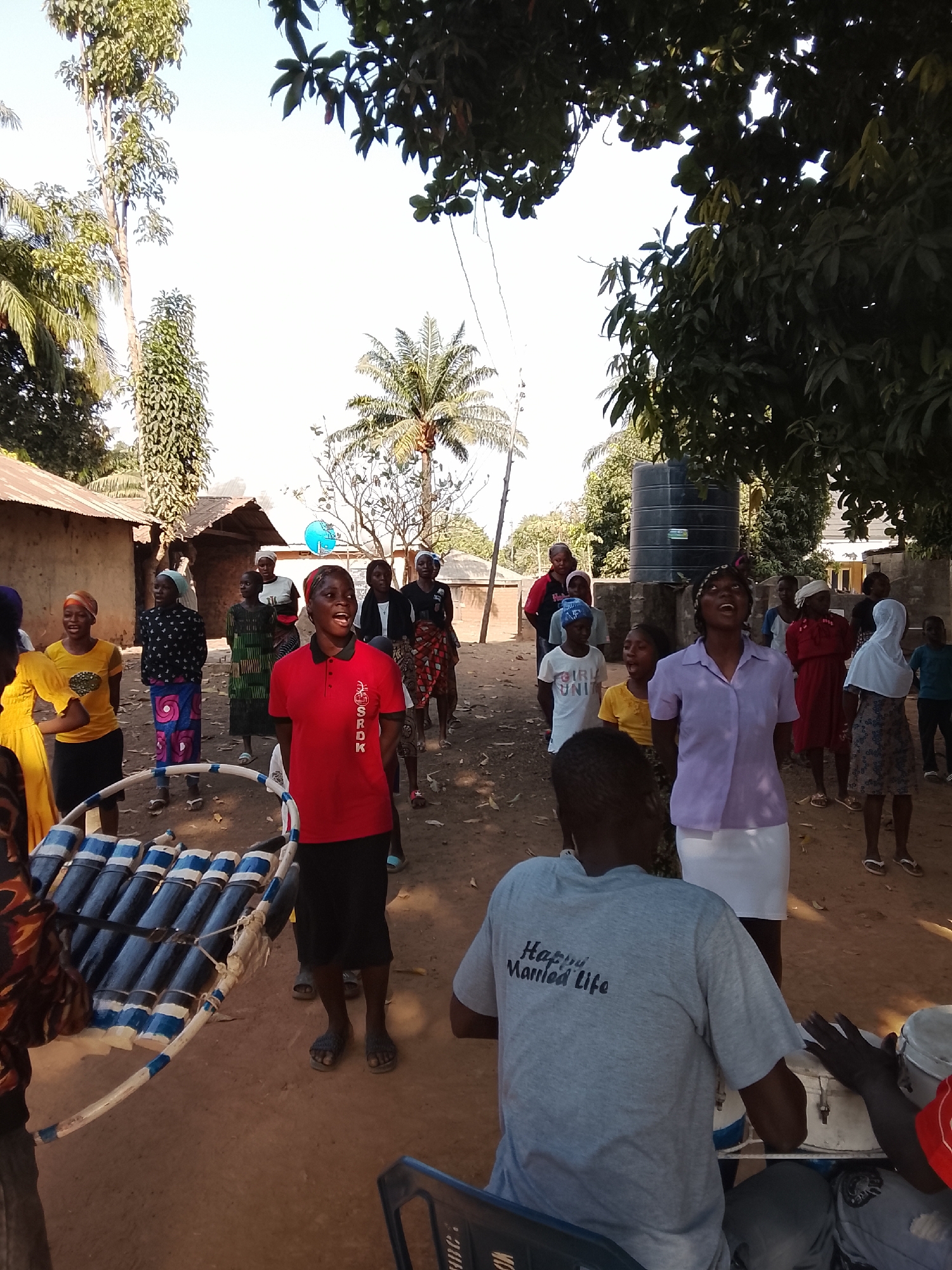 The image depicts an outdoor gathering of approximately 20-25 individuals, primarily Black women and children, engaged in a communal activity within a rural or semi-urban setting in Unknown, Unknown. The scene is illuminated by natural daylight under a clear sky, with dirt ground underfoot. In the foreground-left, a woman wearing a red polo shirt with "SRODK" text on the front is singing, her mouth open and head tilted slightly upwards. Adjacent to her, a person whose body is mostly obscured holds a unique musical instrument composed of several dark blue and white cylindrical objects strapped horizontally onto a white, U-shaped frame. In the lower right, a man seen from the back, wearing a grey t-shirt with "Happy Married Life" printed on it, is seated on a blue plastic chair, playing two white percussion instruments. To his left, a woman in a light purple collared shirt and white skirt is also singing, looking upwards. A young individual in a white t-shirt with "GIRL UNI" text is visible behind this woman. Other individuals, including adults and children, are positioned throughout the mid-ground and background, some with open mouths suggesting participation in singing, and others observing. Clothing varies from patterned skirts and headscarves to t-shirts. The environment includes several rustic, single-story buildings with corrugated metal roofs on the left side of the background. Abundant green vegetation, including tall slender trees and palm trees, frames the top and sides of the image. A large black water storage tank on a concrete stand is present in the mid-right background. A blue, dish-shaped object is visible further back among the trees. Overhead wires are discernible across the scene.
