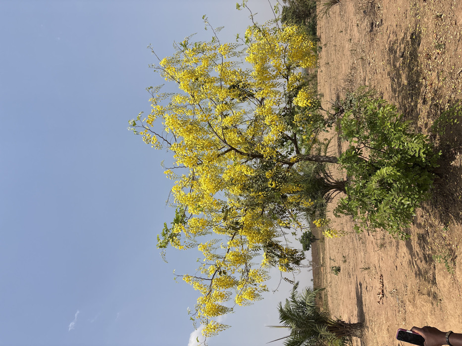 This image depicts an outdoor, arid or semi-arid environment under a clear blue sky with minimal cloud cover. A deciduous tree, approximately 4-5 meters tall, stands centrally, heavily laden with numerous bright yellow, pendulous flower clusters. Its branches also bear some green leaves. The ground is composed of dry, reddish-brown earth with sparse, short green vegetation, including small bushes directly beneath and around the central tree. In the left mid-ground, two smaller palm-like trees are visible. Additional, scattered green foliage and trees are present in the distant background, blurring into the horizon. In the lower-left foreground, a dark-skinned hand holds a black smartphone, oriented vertically, with its screen reflecting light, suggesting the capture of the image. The scene is located in the city of Arak, Nigeria.