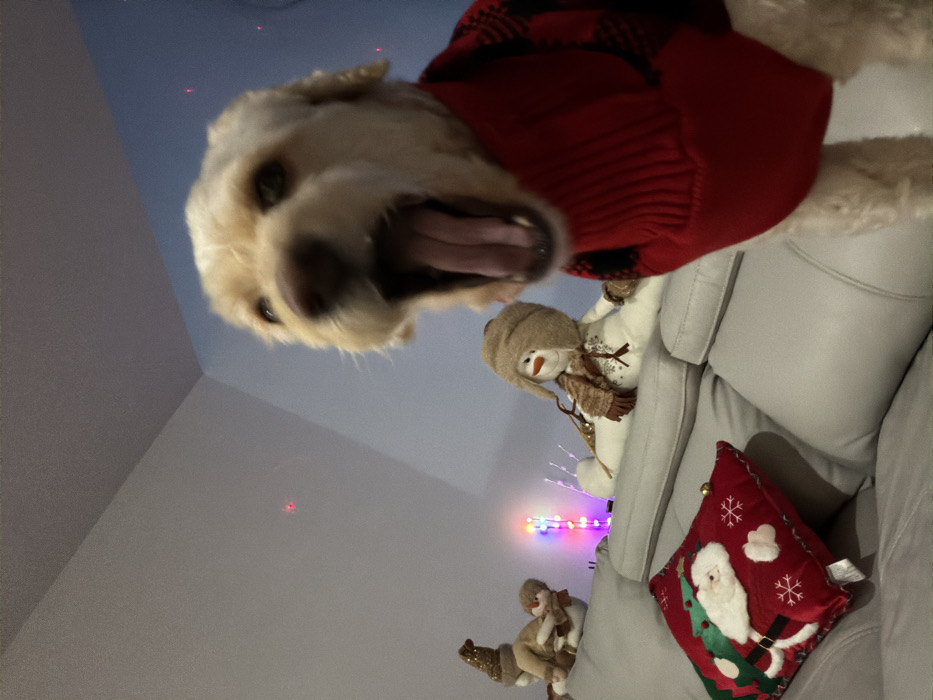 - "A dog wearing a red sweater appears to be yawning or barking at the camera, held at an odd angle, from the top of a gray couch with Christmas decorations" by FM-LC3mB2, licensed under CC BY 4.0