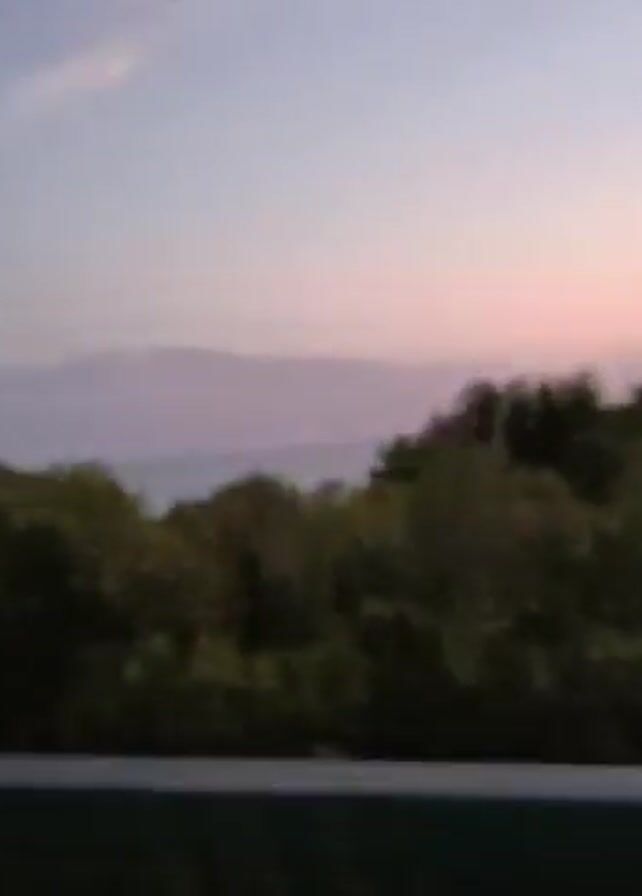view from a bridge, looking out at a body of water surrounded by trees. The sky is a mix of light blues and pinks, indicating either sunrise or sunset. The foreground includes the green railing of the bridge.