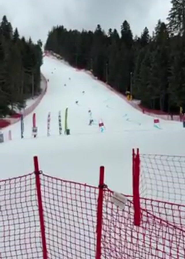 ski race on a snow-covered slope under an overcast sky. Several skiers are visible on the course, marked with red and blue gates. A young skier, wearing a dark ski suit and helmet, skis toward the camera, navigating through the gates. The course is bordered by a red safety fence and pine trees. Flags and banners are placed alongside the course. A few spectators are visible in the background.
