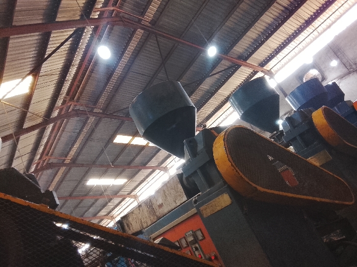 The interior of a warehouse features industrial machinery. Large machines with funnel-shaped hoppers and yellow-ringed covers dominate the foreground. The machinery is primarily blue and gray. Above, the warehouse's corrugated metal roof is supported by a network of metal beams. Bright lights illuminate the ceiling, casting a glow on the machinery below. A metal grid is visible in the lower left corner.
