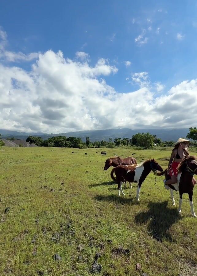 woman in a bikini top and red shorts wearing a woven hat riding a horse in a grassy field. There are two other horses nearby, and a man is standing in front of the woman, taking a picture of her with his phone. Another person stands near the man with the phone. The sky is blue with some clouds, and there are mountains in the background. The sun is shining.